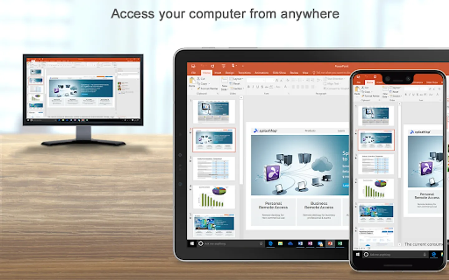 Employees on the go can enjoy all the benefits of remotely accessing applications and data from their BYOD / company-distributed devices as if they were in front of their computers set in offices. Top adoptions include industries using 3D, CAD, CAM, or ones of design, education, government, manufacturing, healthcare; mobile workers who traditionally use RDP / VPN products. With a top performance of streaming and touch screen, employees working with their devices are allowed to easily access and edit their office files, line of business, 3D graphics and customized web applications from homes or on the go; thus enhancing their productivities.