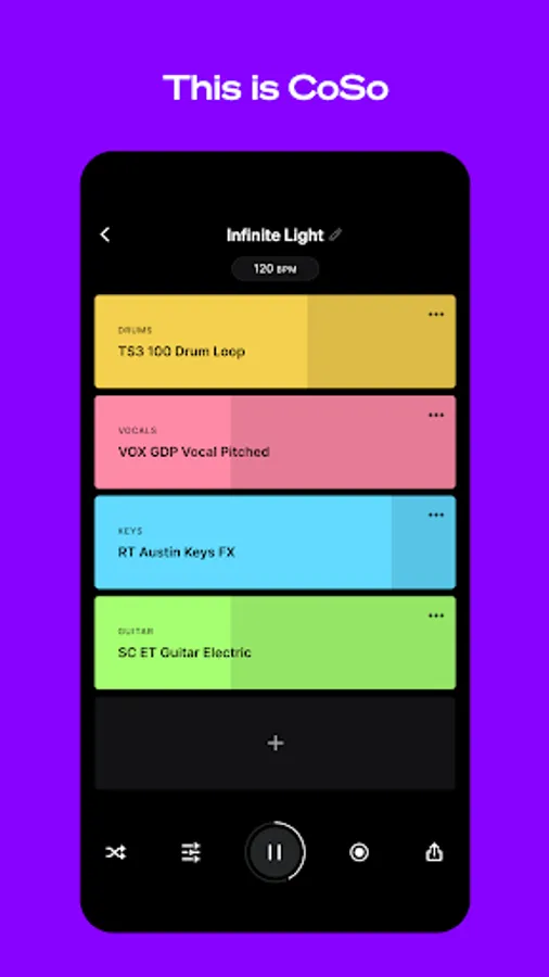 Swipe right to choose a new sound, swipe left to delete, tap a layer to mute it, and long-press to solo. CoSo’s here to create musical momentum.