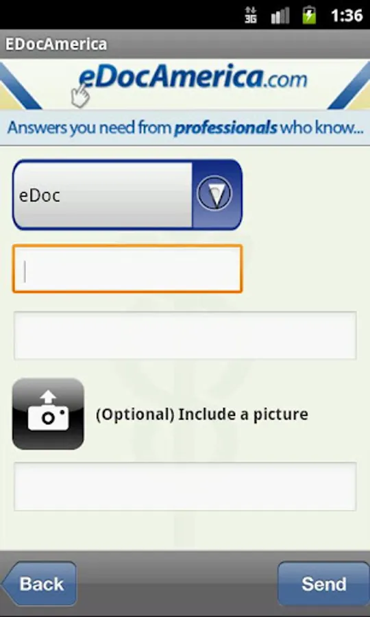 eDocAmerica users can access this app to send in questions to any of the medical team members. eDocAmerica users will also be able to access their medical team answers and respond back and forth with the medical team as needed. The app incorporates the ability for users to utilize the camera capabilities of their phone to conveniently provide the medical team pictures related to their questions.