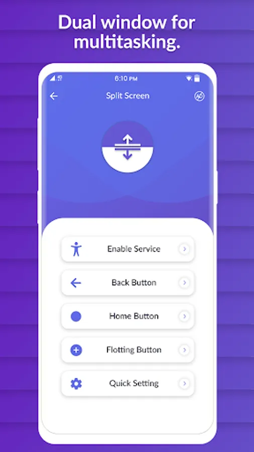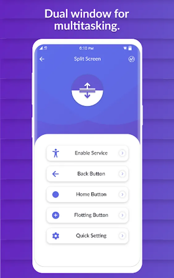 In a Split Screen - Dual Window For Multitasking you can add a floating button on the home screen. To using the floating button you have to first enable it. When you enable the floating button it appears on the home screen. Then you can use the floating button to split the screen. You can also split the screen on single and double click on the floating button.