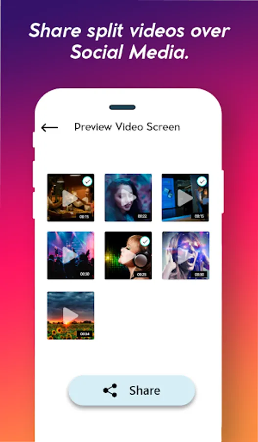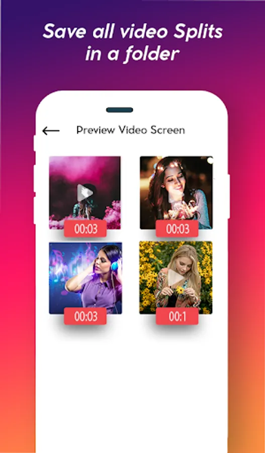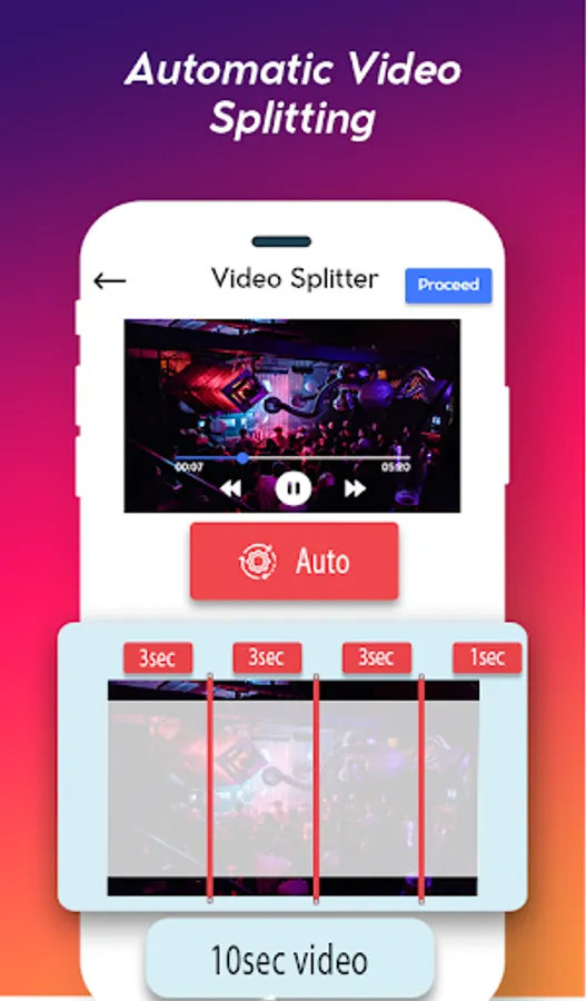 Auto Video Splitter: Auto video split features split clips into 5 seconds, 10, 15, 20, 25, and 30 seconds videos story. Video splitter for status saves time to split videos story.