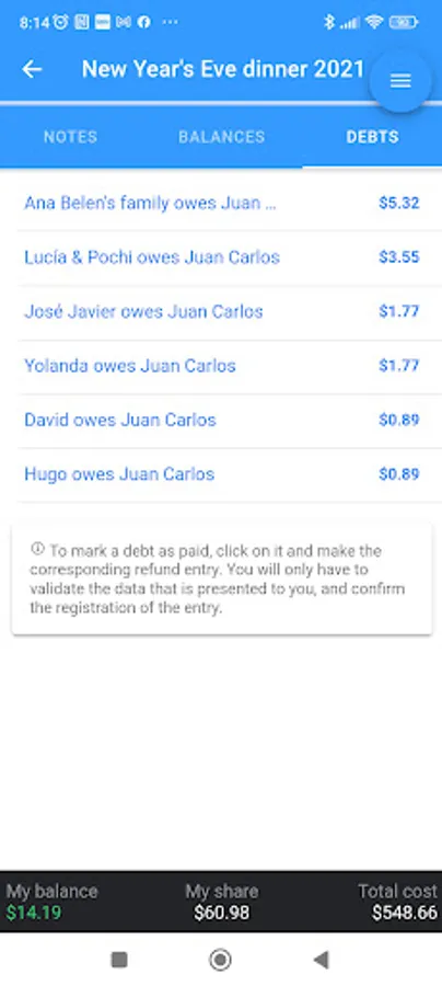 We can also see how much we owe each person, based on the current status of the group. If the group is square, the application will notify us of this situation.
