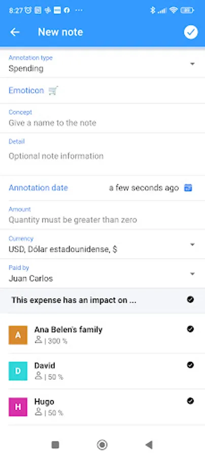 Not all people have the same weight in different expenses. For example, in trips, we could decide that the children are only going to be passed on 50% of the expenses; however, to adults, 100%. We can assign a percentage to each participant and, by default, in the notes in which they take part, this percentage will initially be assigned to them (although this can also be changed later).