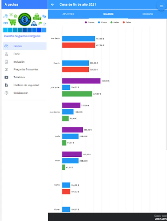 There are graphs where you can see, by participant, the relationship between the fees that we have to contribute to the expenses incurred, according to our participation percentage, and the balances of each participant.