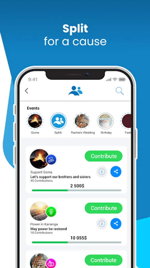 Splitti allows you to contribute for your loved ones or causes. With Splitti, easily create a group and collect money with friends to celebrate a birthday or wedding, participate in a baby shower, organize a leaving-do party, help a close one through grief, split payments, etc.
