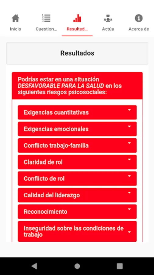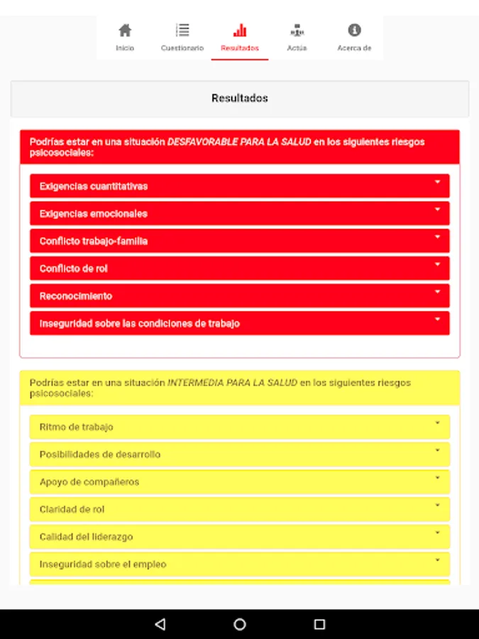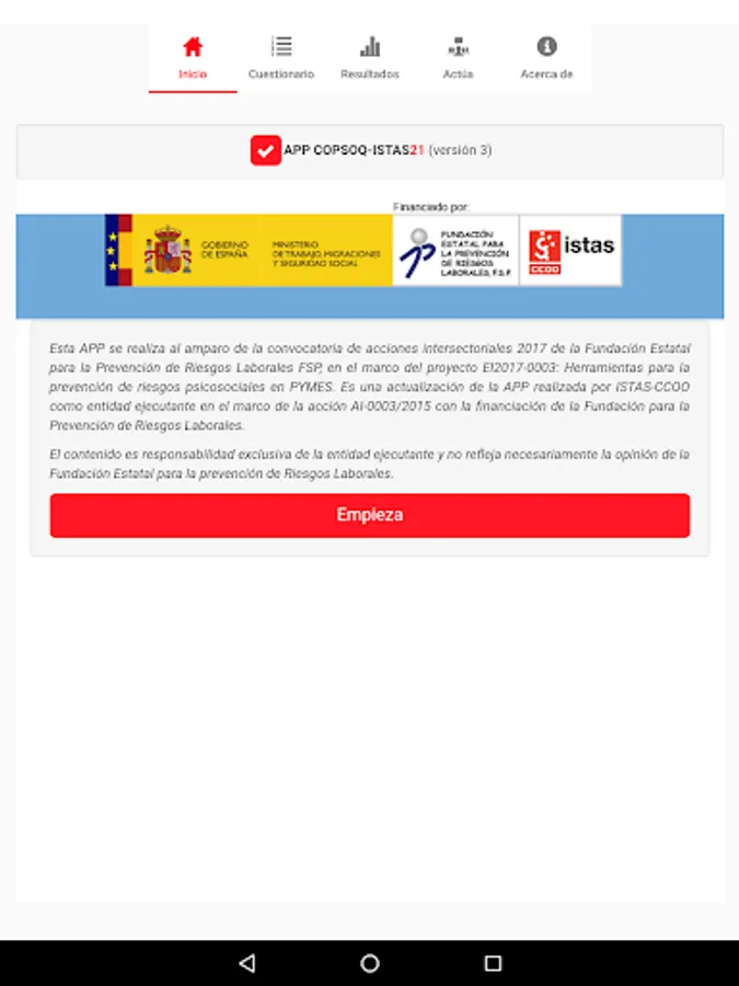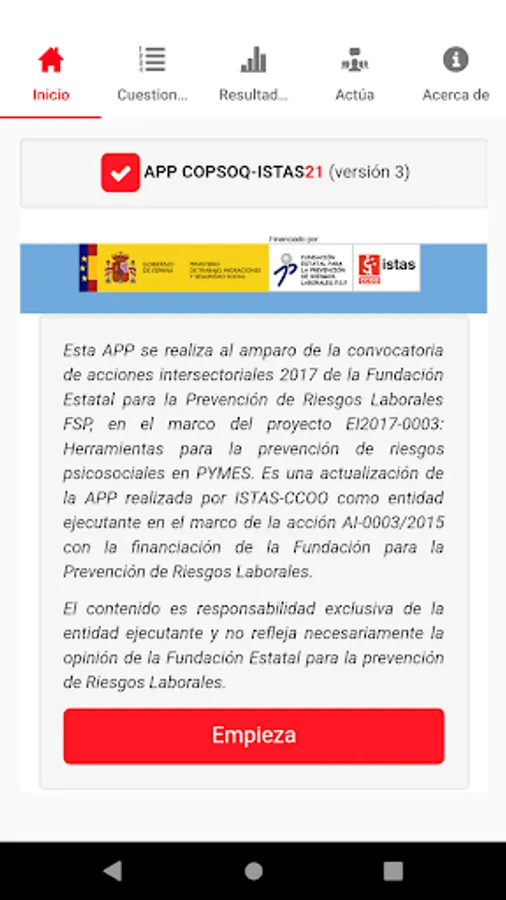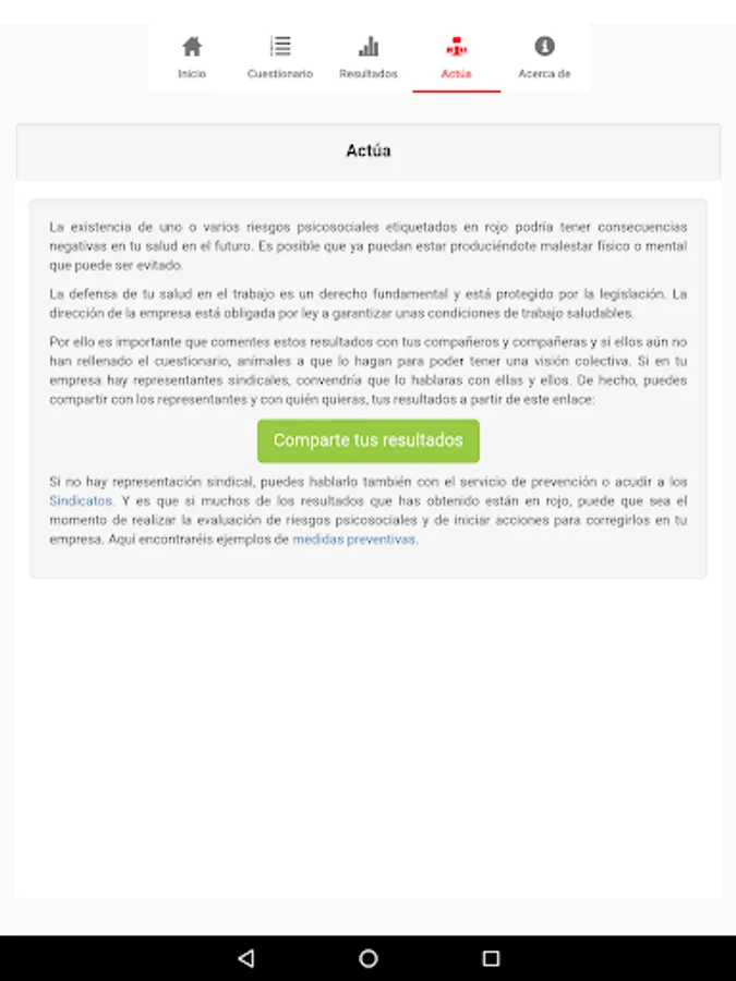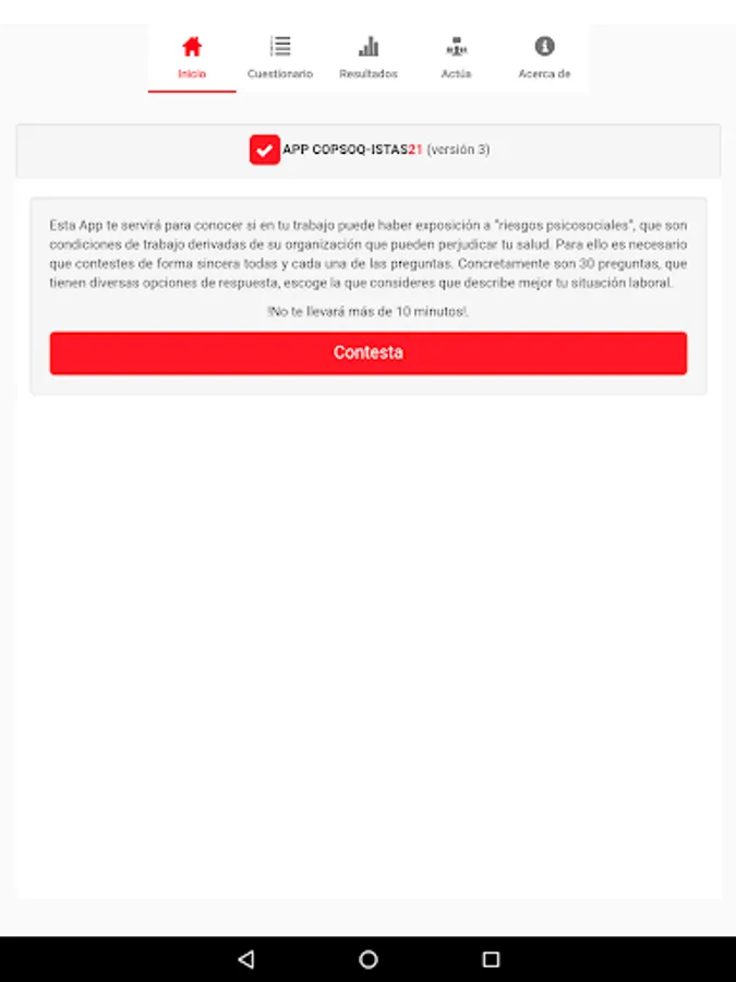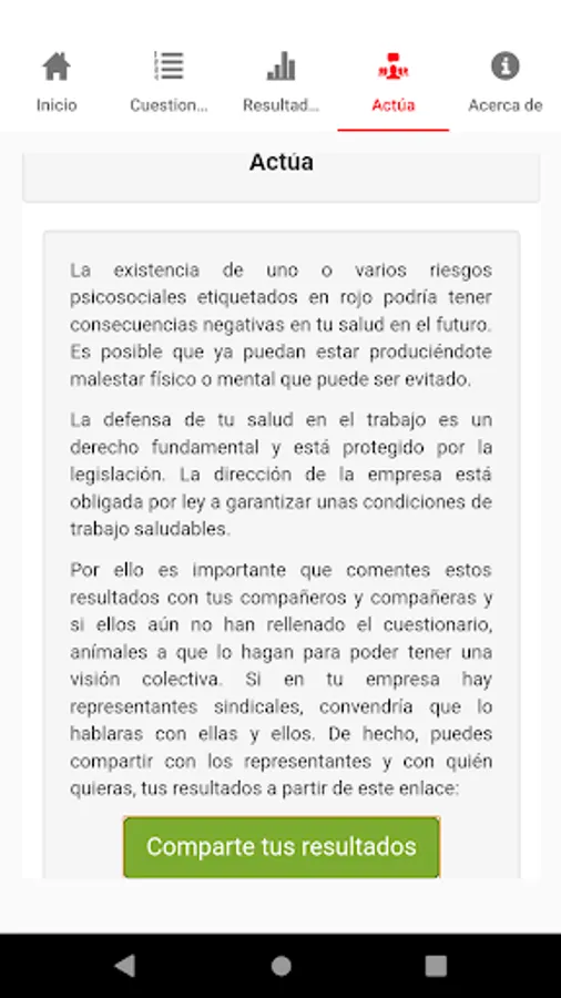 This free APP for mobile phones and tablets aims to approach the prevention of psychosocial risks. You answer a questionnaire about your working conditions and you can share your results via WhatsApp, Gmail, BlueMail, Telegram, etc.