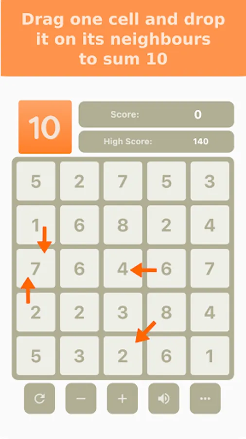 Drag and drop the tiles. When two cells can sum 10 or less, you can merge them by moving one into its neighbors.