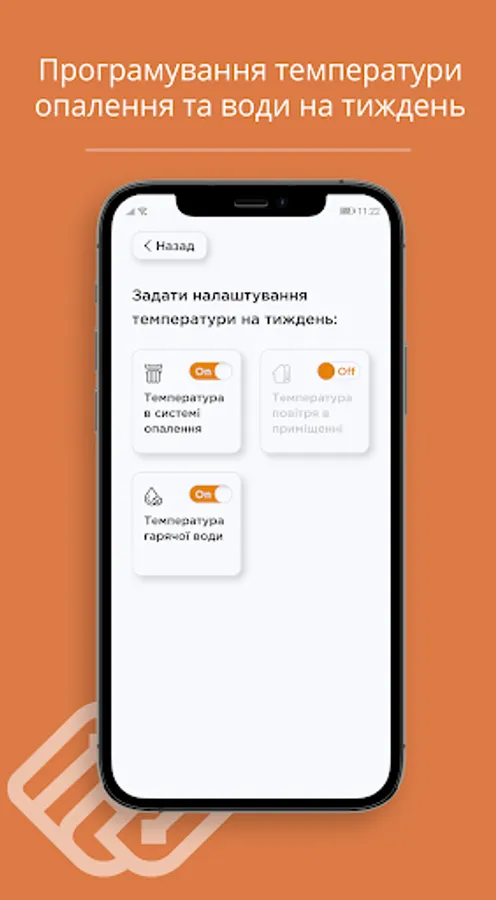 Turn on and off the water heating mode. Program the water temperature a week in advance. * Works in a complete set of a copper, with the water heating boiler connected to system. In all other cases, the function is disabled.