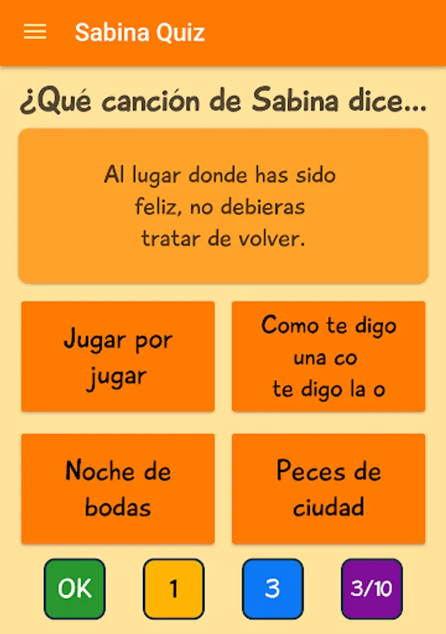 Sabina Quiz is a quiz based on songs of Spanish singer Joaquin Sabina. It is not required access to Internet, this game is standalone.