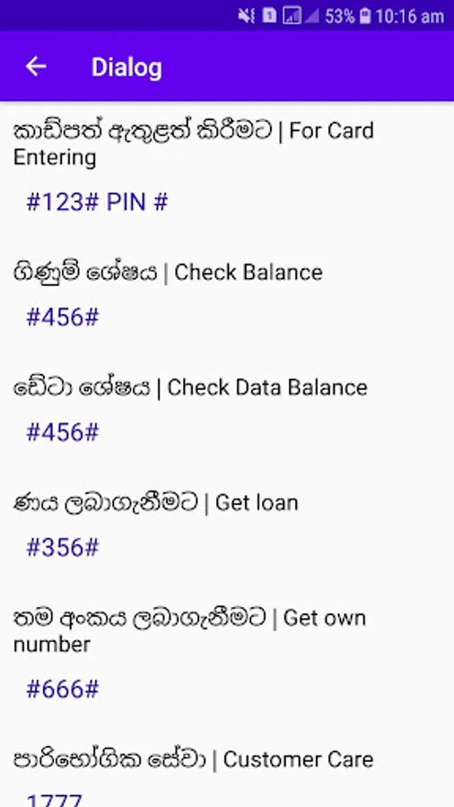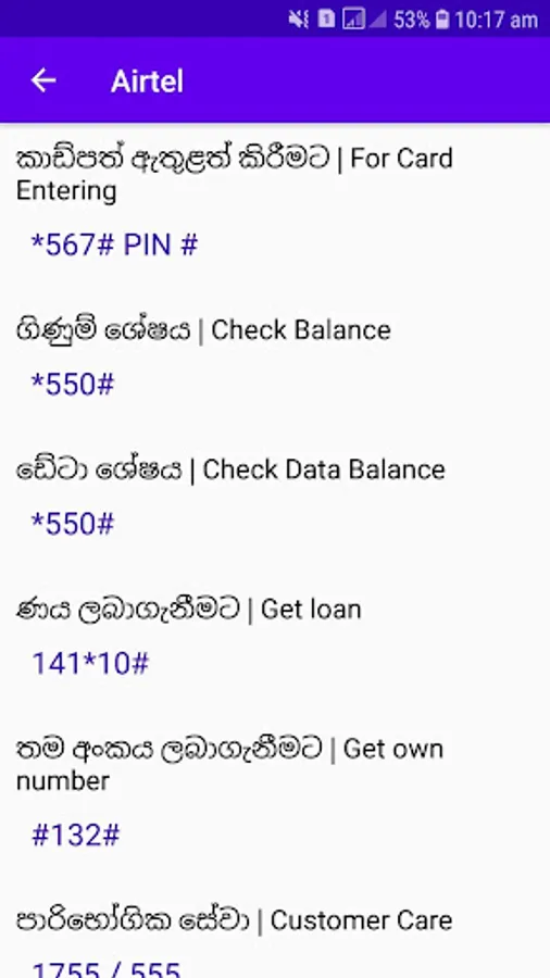 කාඩ්පත් රීලෝඩ් කිරීම, ණය ලබා ගැනීම ආදී සඳහා ඇති කේත අංක තවදුරටත් ඔබට මතක තියා ගැනීමට අවශ්ය නොවේ. එම සියලුම කේත අංක මෙම ඇප් එක මගින් පහසුවෙන් ලබා ගැනීමට හැකියාව ලැබේ. (සියළුම සිම්පත් වර්ග සඳහා කේත ඇත)