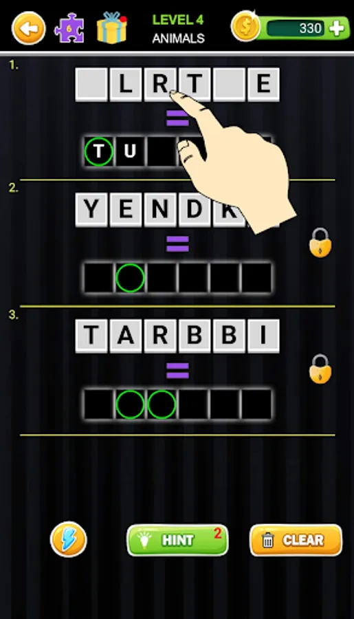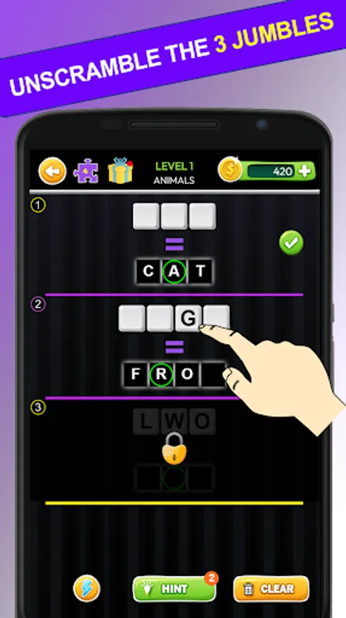 β Use the Lightning Bolt to reveal the first letters for each of the 3 jumble puzzles