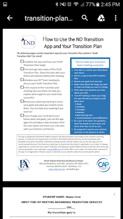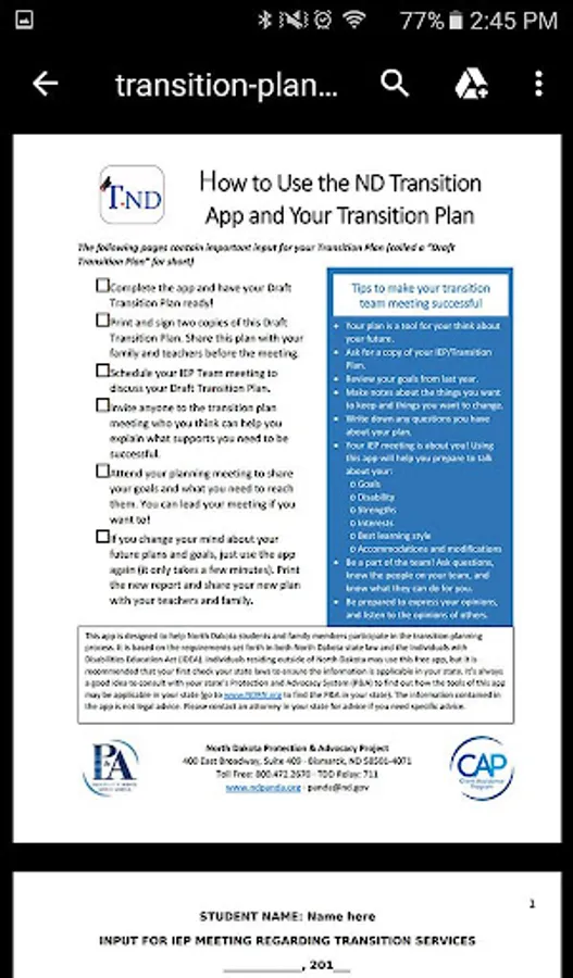 This app is intended to serve as a guide to North Dakota students, parents and educators on transition planning based upon requirements of the Individuals with Disabilities Education Act and North Dakota state law. Individuals residing outside of North Dakota may use this free app, but it is recommended that you first check your state laws to ensure the information is applicable in your state. It's always a good idea to consult with your state's Protection and Advocacy System (P&A) to find out how the tools of this app may be applicable in your state (go to www.ndrn.org to find the P&A in your state). The information contained in the app is not legal advice. Please contact an attorney in your state for advice if you need specific advice.