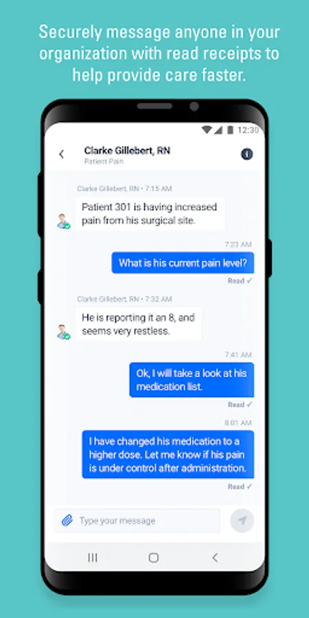 • HIPAA-compliant secure messaging with message status (Sent/Delivered/Read)