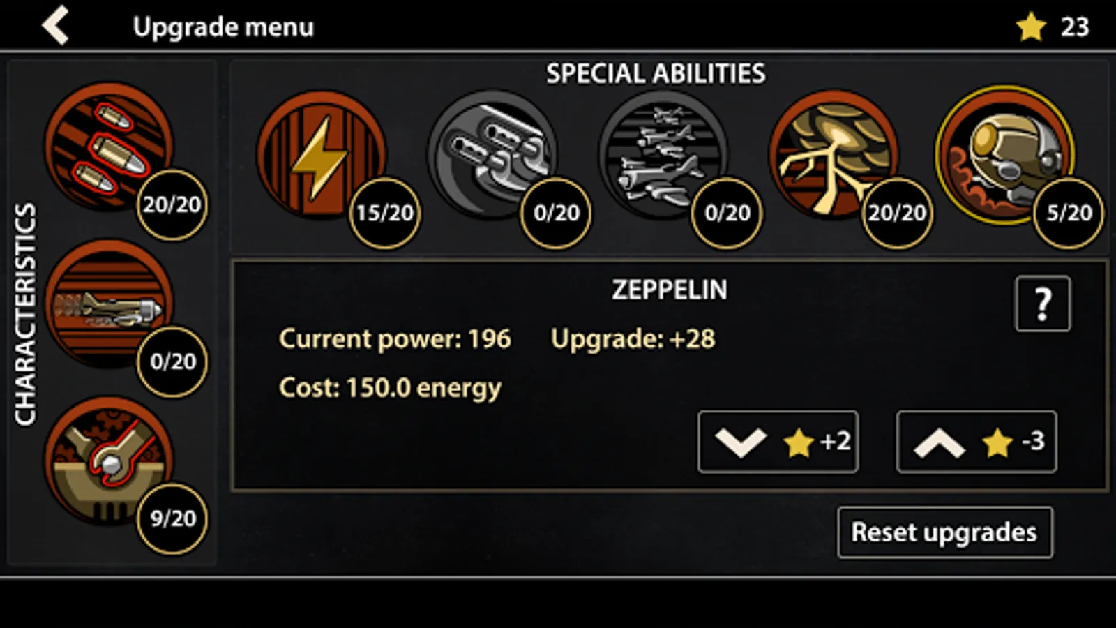 The game has RPG element to it – by completing levels in different game modes you earn "stars" - they can be used to improve characteristics and special abilities.