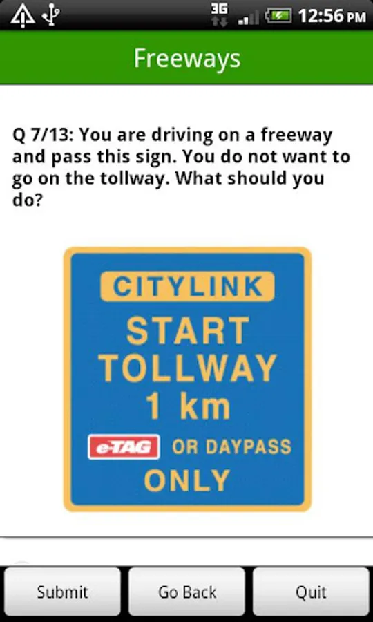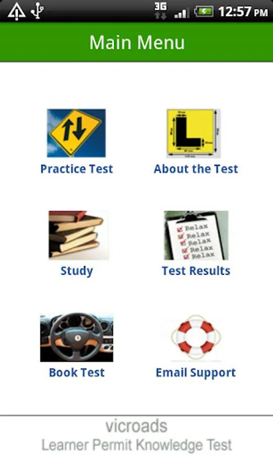 Get your learner's license by practising the VicRoads Learner Permit Knowledge Test for car. This app contains 338 test questions all based on the Road to Solo Driving handbook. You can run a real test or configure your own test by choosing the various road rules categories, time limit and more. All test results are stored. No Internet access required!! Once you feel ready, use this app to book a test online, locate a test centre or call the VicRoads Customer Service Centre.