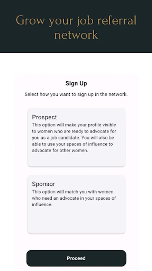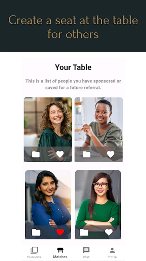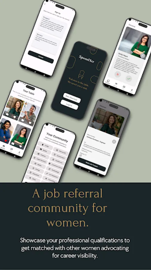 Showcase your professional qualifications to get matched with other women advocating for career visibility. Using the swipe-to-match model and a user journey that makes it easy to make a referral in minutes, Sponsor Her cuts the tough talks, tension and time for women seeking a job. Join us to create more seats at the table for the way women navigate career opportunities.