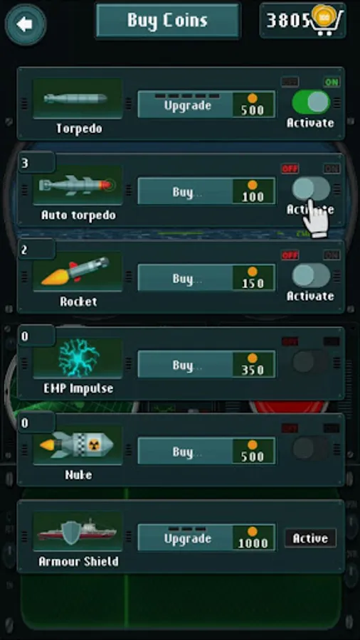 - Upgrade armor shield of your submarine and upgrade speed of your torpedoes
