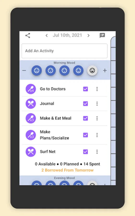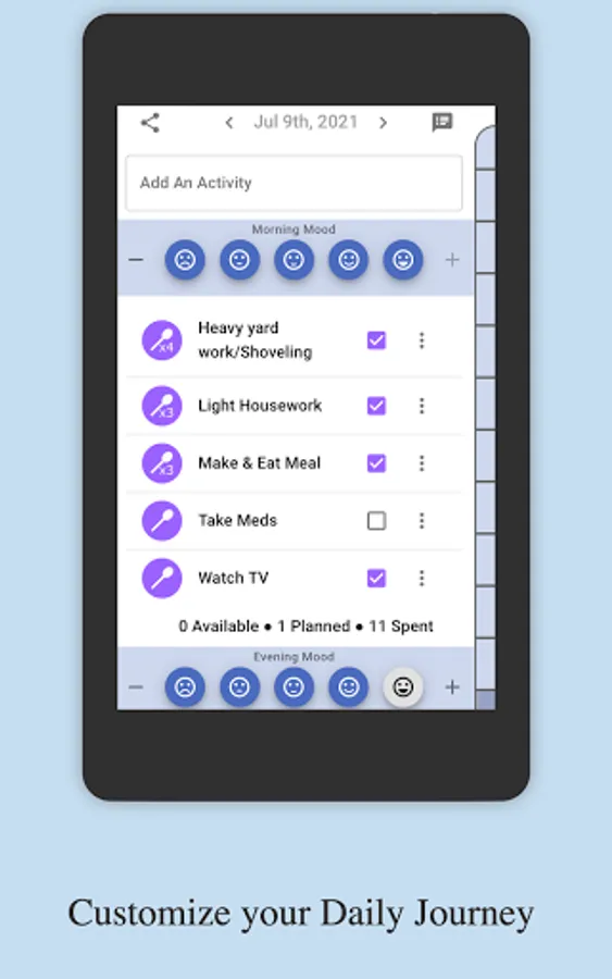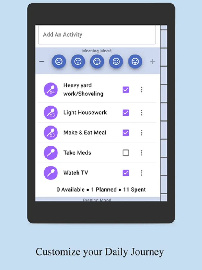 Based on the hugely popular Spoon Theory, this app helps you manage your "spoons". Track and monitor your daily activities to see how they affect your mood and energy levels.