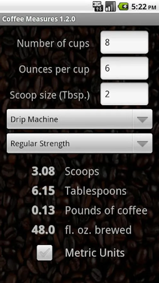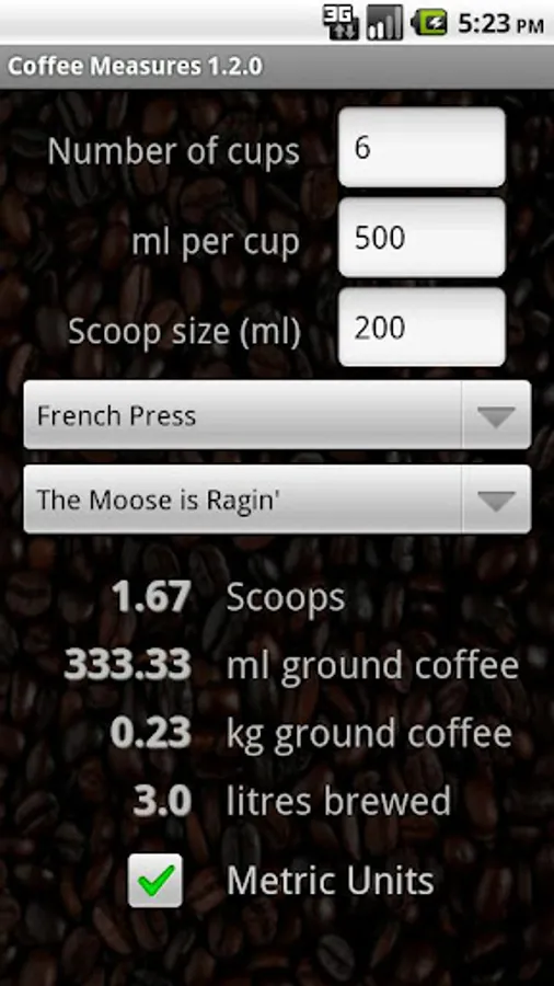 Coffee Measures coffee brewing calculator by Colorado Mountain Coffee helps you make the perfect cup! Calculate the ideal amount of ground coffee needed for a drip machine, French press, espresso maker and percolating urn. Different brew strengths and customisable cup, scoop & batch sizes can be input to meet any requirement.