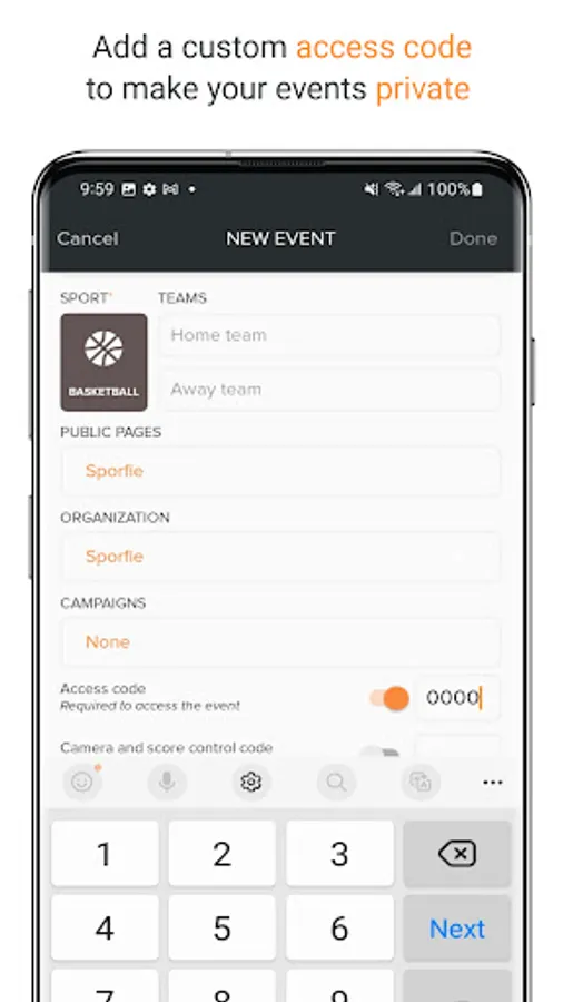 * Private Events: Add a pin code to your events to keep your games or practices restricted to the audience you want, whether that’s just parents, coaches or players.