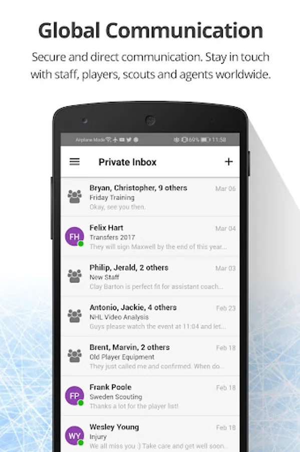 SportContract Communication allows Club Owners, Club CEOs, Managers, Managers Sport, Coaches, Scouts, Players, Player Unions, Agents worldwide to communicate with each other directly and discreetly.