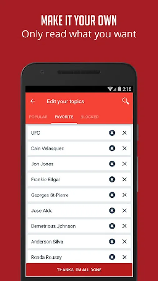*Customized news feed - if you want to follow a specific fighter or specific topics, like 'schedule' - no problem. Select the topics you want to follow or block on the topics list