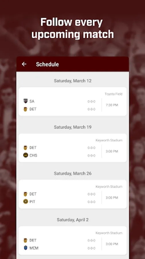 Access the team schedule, view player updates, watch the best highlights and get prepared for matchday with your favorite USL club: Detroit City FC.