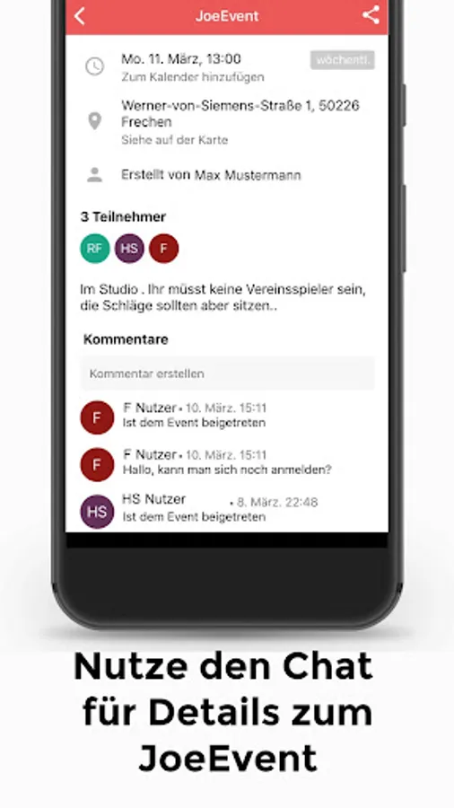 New for clubs and private sports groups: Organize as a team and create several events within your group. The chat function of the team can also be used to make general arrangements within the group.