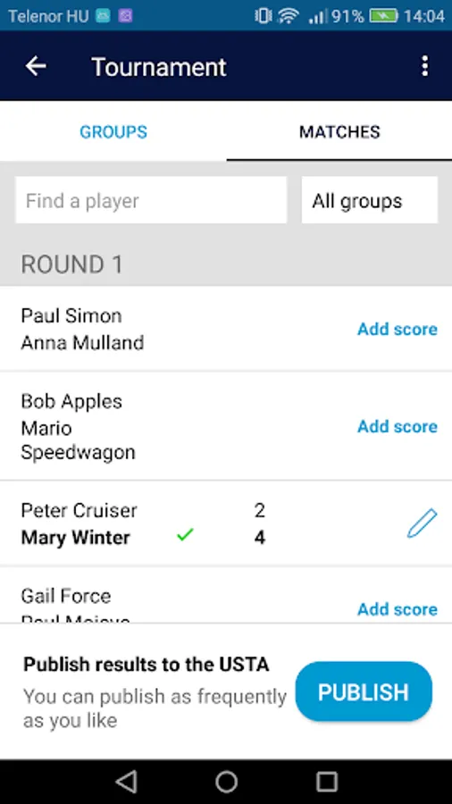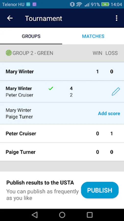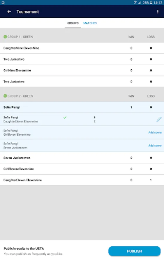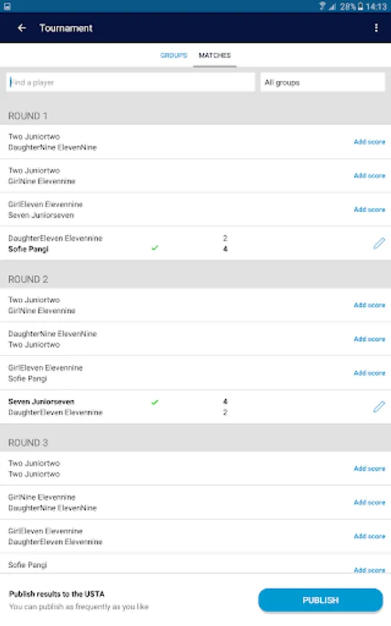 The app provides an on-court player check-in and an outstanding Round Robin event management tool that allows you to check-in players, automatically group players based on age and ball color, move players within groups, modify score formats, share score cards and publish results.