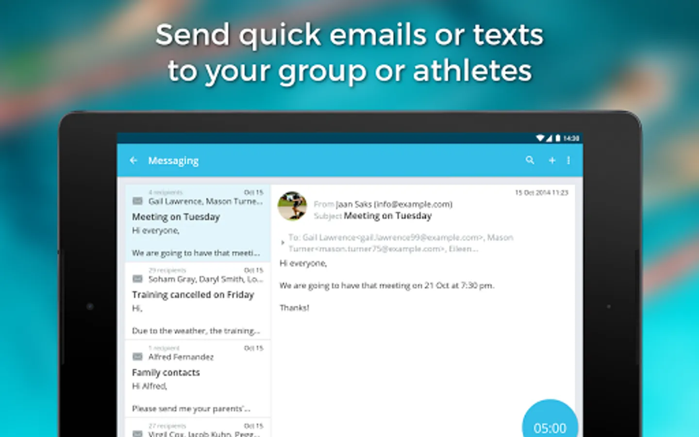 • Send messages – quickly send group email or SMS to your training groups, athletes or parents.