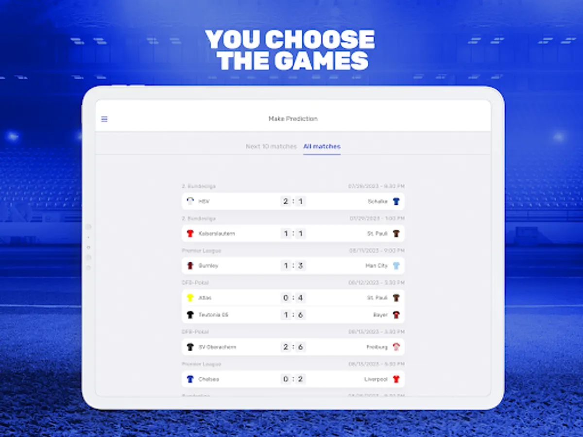 Create your own bet slip and predict on as many matches from different competitions as you like. Just one selected match day or a colourful mix of matches – the choice is yours.
