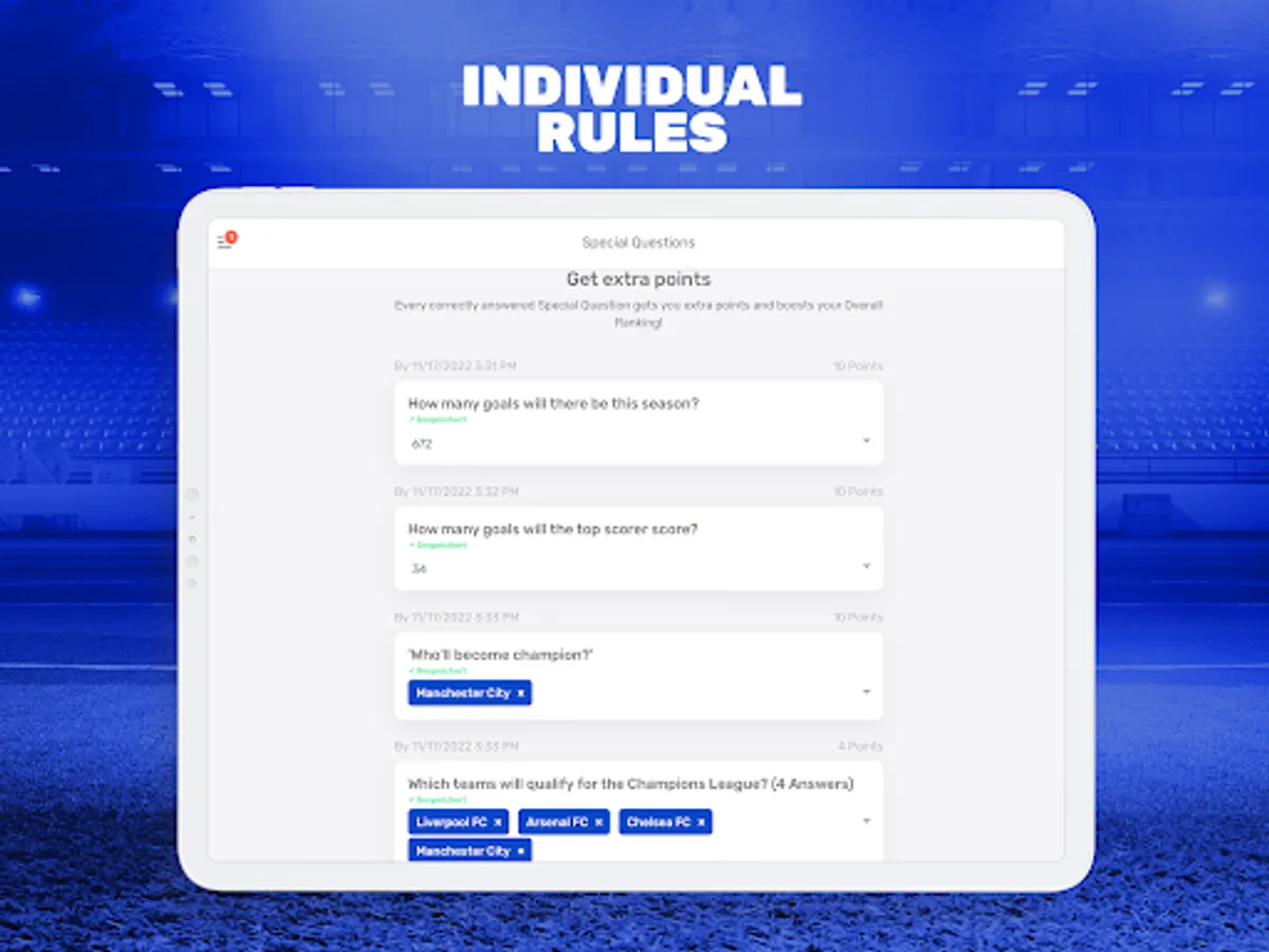 Predict on all the matches of your favourite team in one prediction game group throughout the full season. If you like, you can also select up to three favourite teams.