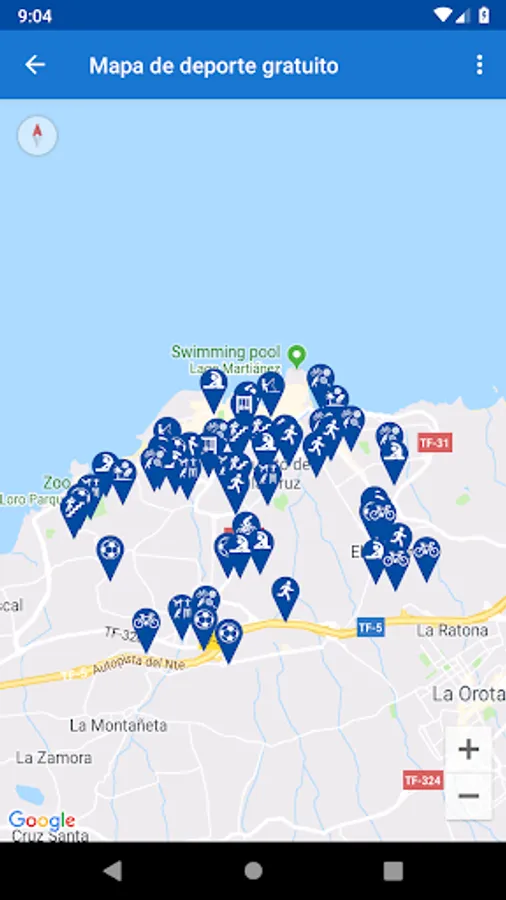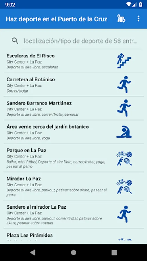 An interactive map of the city from the north part of Tenerife, Puerto de la Cruz, through which you can identify all the places around the city where to practice different types of sports, for free, without paying for the service of using the space.