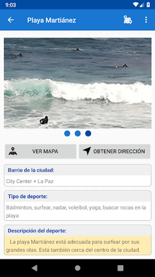 🌟 Each entry contains the title, sport type, description, and the possibility to see that location on the map or to get direction for that location;