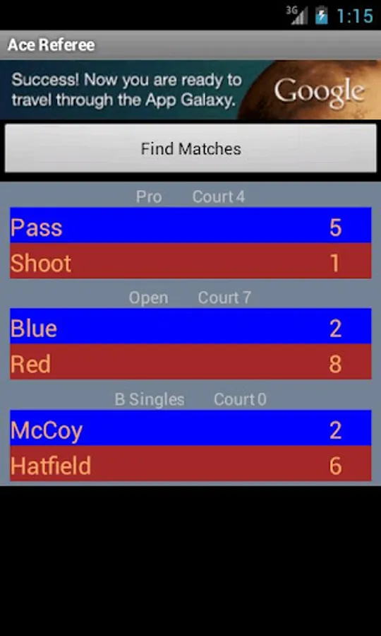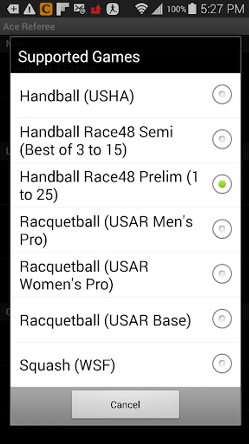 Ace Referee is a companion app for handball, racquetball and squash referees. If you have ever climbed a ladder with a pencil in your mouth and a scorecard in your hand, then Ace Referee is for you. Ace Referee eliminates the referee's need for pencil and paper. It keeps track of score, server and timeouts right on your handheld device. Ace Referee also adds timers for game intermission, timeouts and equipment timeouts. Ace Referee also allows spectators to view scores of up to 10 matches simultaneously from within the app, and now using a ChromeCast device, users can create a video scoreboard with scores of up to four matches.