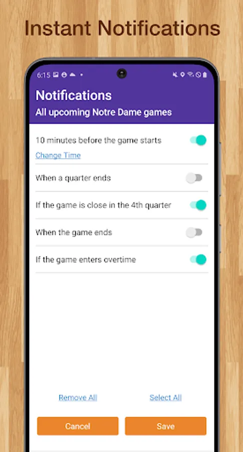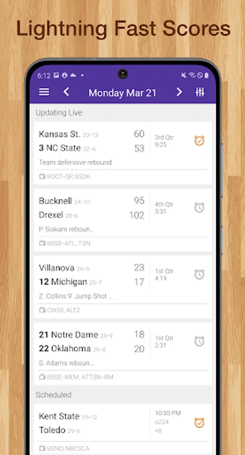 * Never miss a game! Set an alarm and be reminded to tune in.