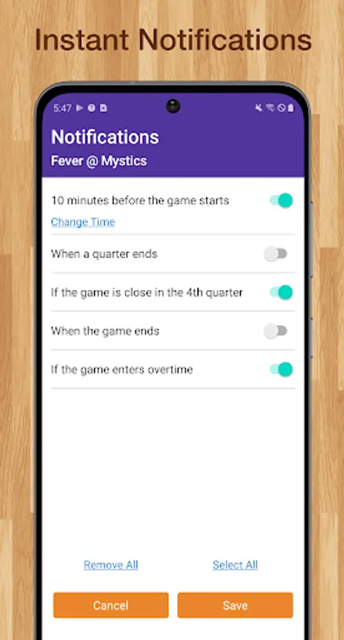 * Never miss a game! Set an alarm and be reminded to tune in.