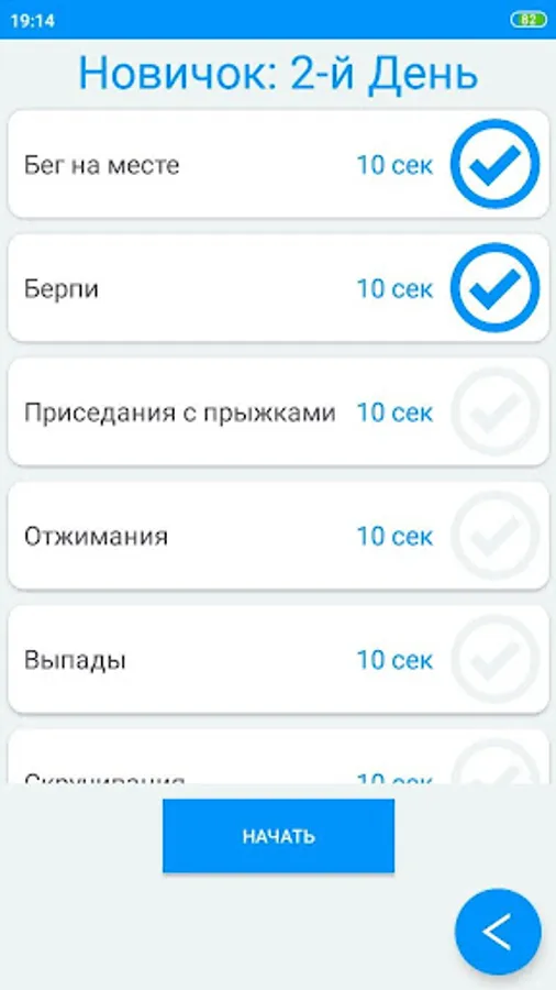 The application includes the most popular exercises, such as burpee, running on the spot, jumping with claps and others.