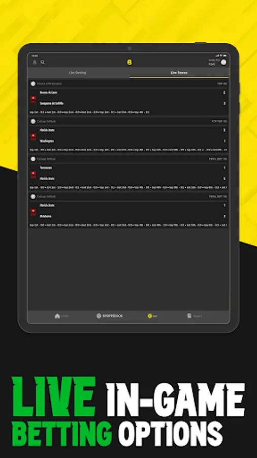 Get live in progress sports odds and live bet as games progress. The Bet on Sports betting simulator app offers a native and full LIVE In-Game betting software, to bet on your favorite teams or events throughout entire games. That's right, you can get real-time sports stats and betting odds and bet minute by minute on events happening right as they unfold.