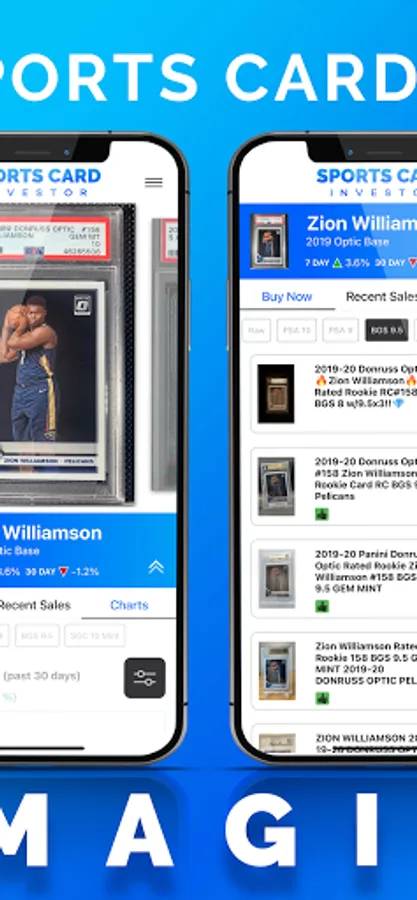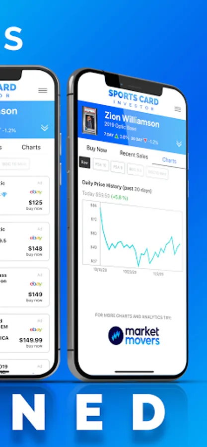 With this all new Sports Card Investor app you can scour through trending cards, search by player, price, year and sport. From there you can scroll through all of the buy it now options on eBay, view the most recent sale prices, and look at how the card is trending over the past 7 & 30 days with data powered by Market Movers.