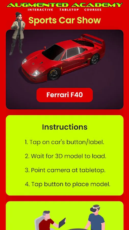 Amazing 3D models of sports cars - show on any tabletop or desk. Perfect for school settings, or just to learn about exotic sports cars. Tap on a button to display iconic sports cars from around the world. Listen to spatial sound narration to learn about sports cars. Sports cars included: