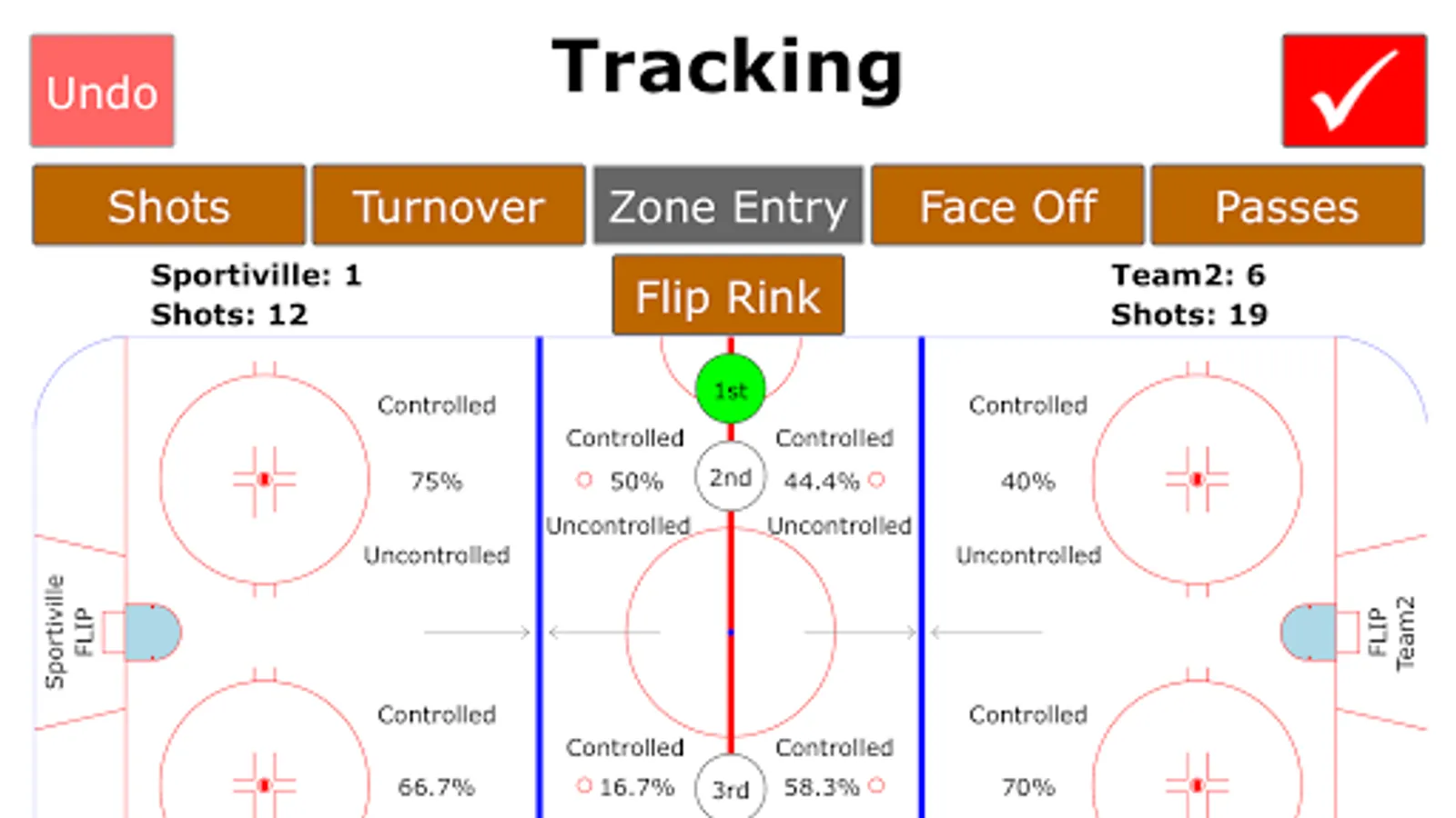 Use the Zone Entries Tracker to capture zone exits--either by player or team-- from your defensive zone and entries into the offensive zone. Likewise, track your opponent's exits from their zone and entries into yours.