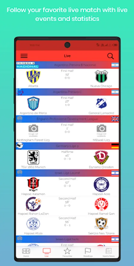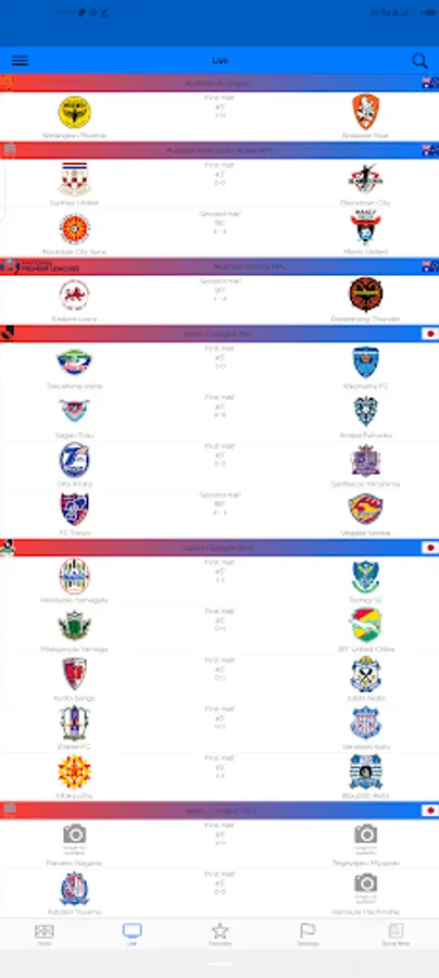 Follow your favorite match on the live's tab. Match events like normal goals, penalty, substitution, red cards and yellow cards etc and game statistics like number of red cards, yellow cards, corner kicks, number of corners, goal keeper saves, shots on goal, shots off goal, fouls, corner kicks and ball possession data is available for both home team and away team.