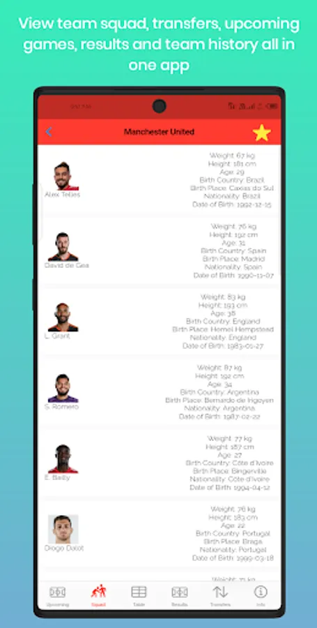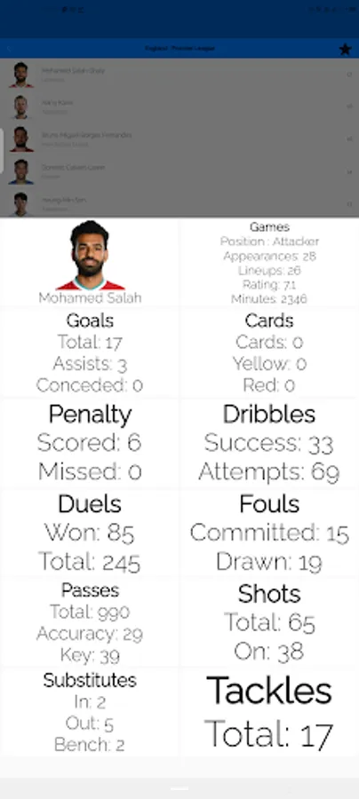 Team data includes squad, upcoming games, games results, team transfer and team history and stadium. The squad data displays all players in a team and their personal information like number, nationally, height, weight and age. Clicking on a player will reveal the player's statistics for that particular season. The player's stats include games, goals, cards, duels, dribbles, passes, shots, tackles and substitutes.