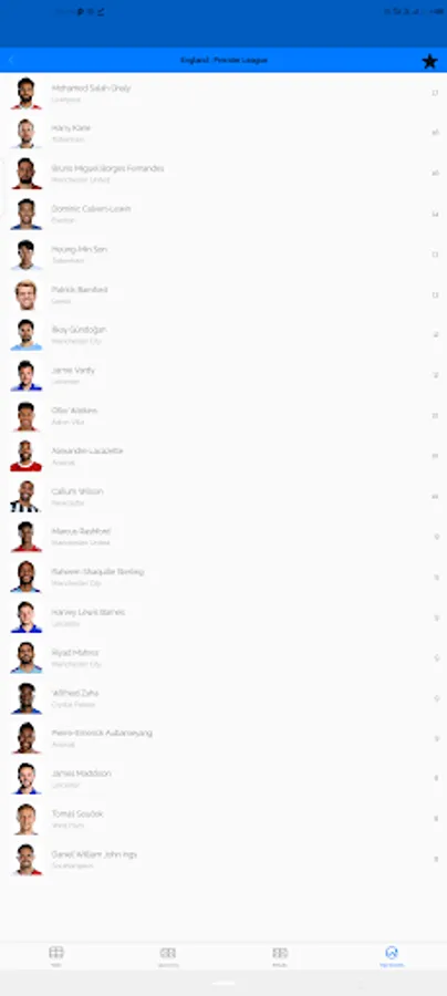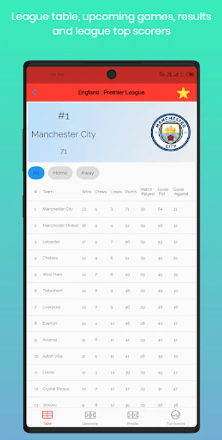 League table or standings, league upcoming games, league finished matches and top scores data is found in the league's tab. The league table is updated after each game is finished and includes team points, wins, draws, games played, goals for and goals against for when the respective team is home, away or both. Top scores data includes the top 20 goals scorers in a league in a particular season. Clicking on any top scorer will reveal the players statistics for that season.