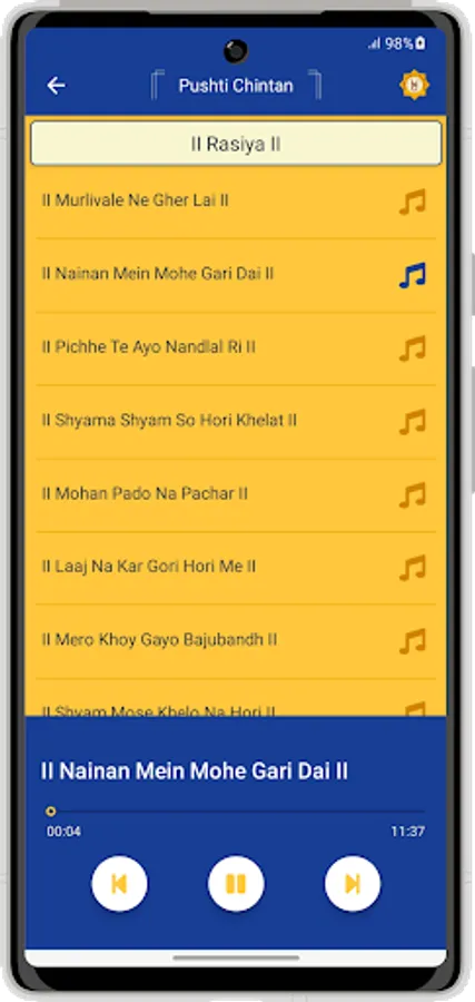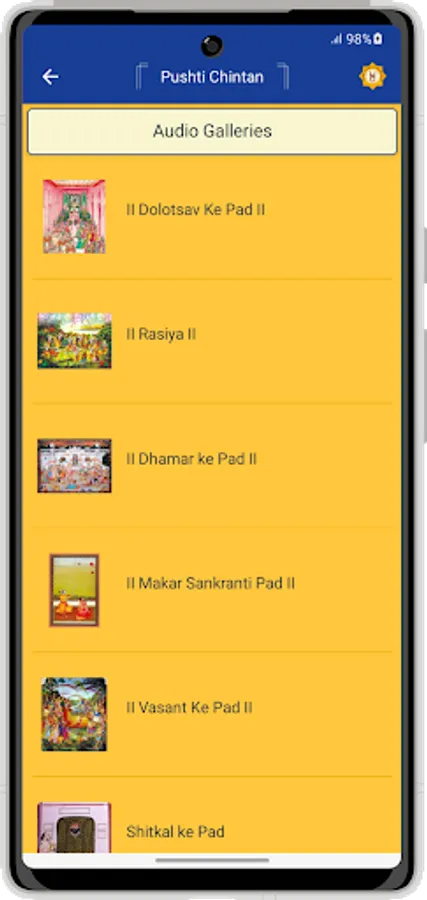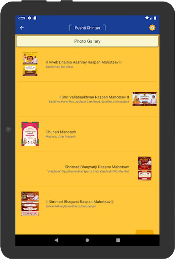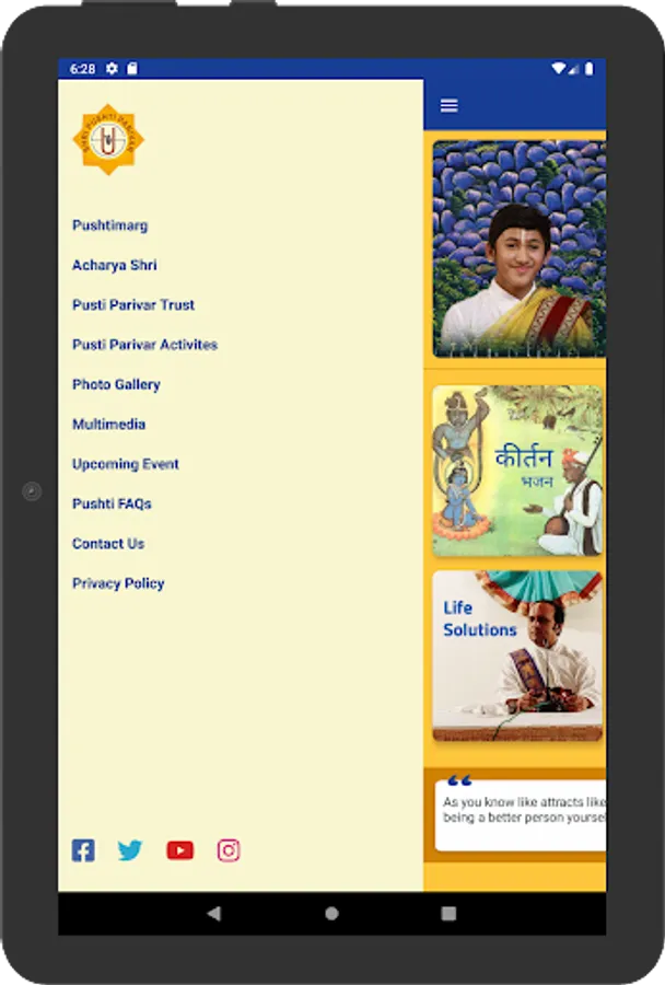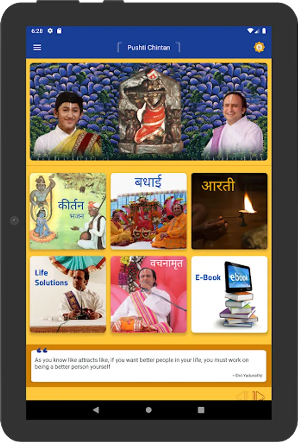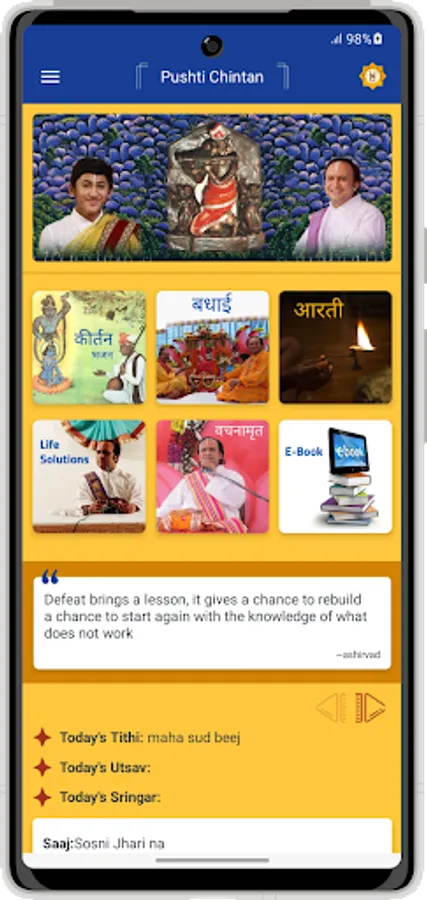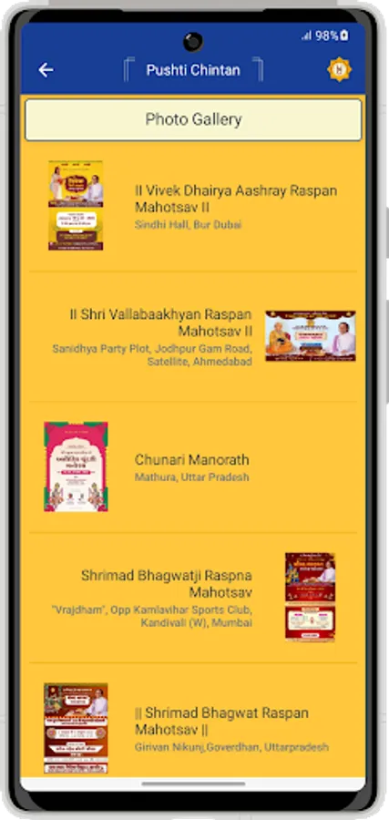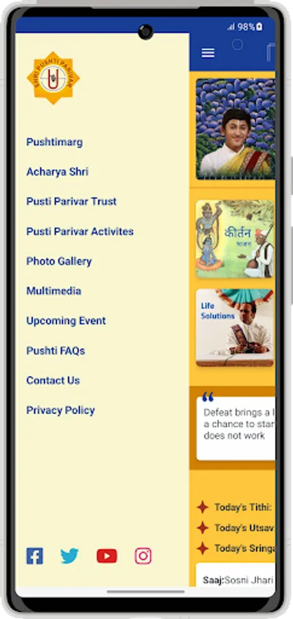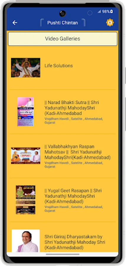 App Contains information about Pushti Parivar Trust, AacharyaShri, Bhajans in mp3 Format, videos of various Pushtimargiya Granth, Photos of Latest Events occur under Trust and Brijdham Satellite, Details of Activities governed by Pushti Parivar, Aacharya shri YadunathJi Mahodayshri.