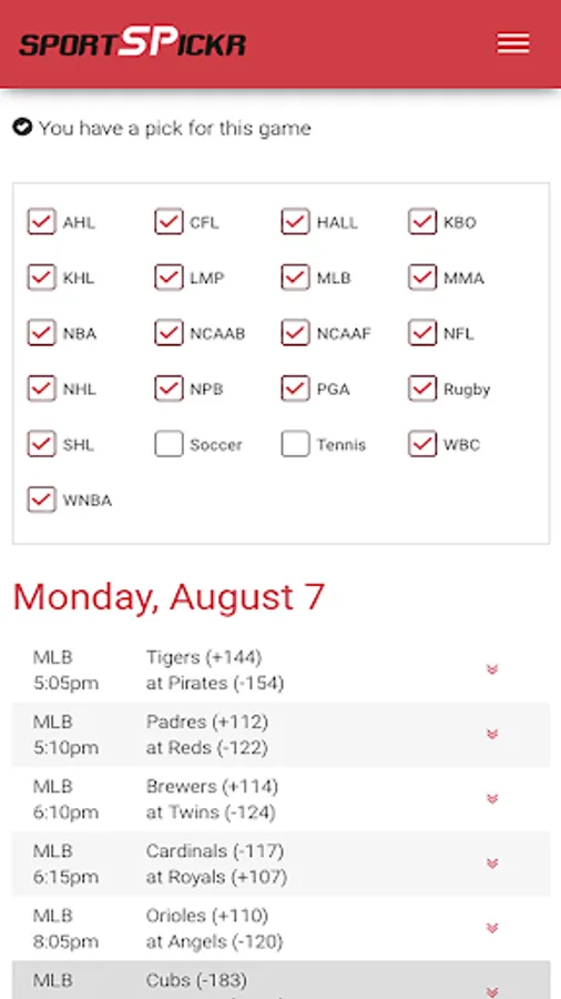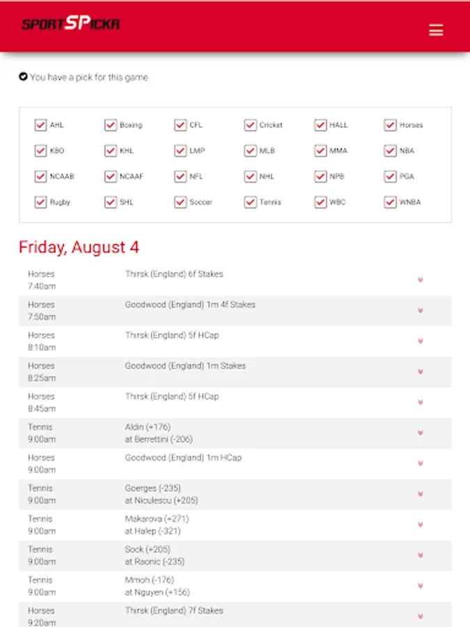 - Choose to get notifications when: opponent makes pick, your pick settles, or your opponents pick settles.
