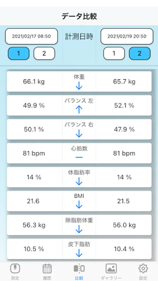 With the recorded data, you can easily grasp the changes in your body, such as displaying daily fluctuations on a graph and comparing the data of two specified dates.