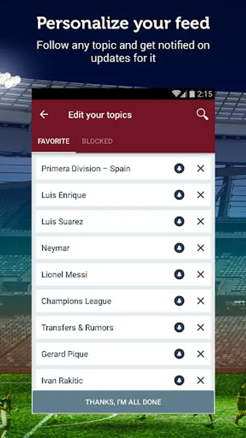 * Customized news feed - if you want to follow specific players or specific topics, like 'Transfer rumors' - no problem. Just select the topics you want in the topics menu. Or - you can simply filter out (block) topics that don't interest you!