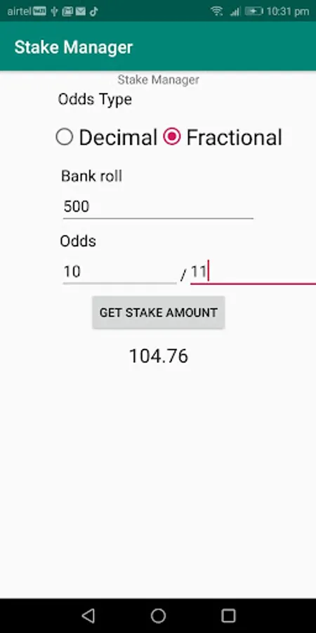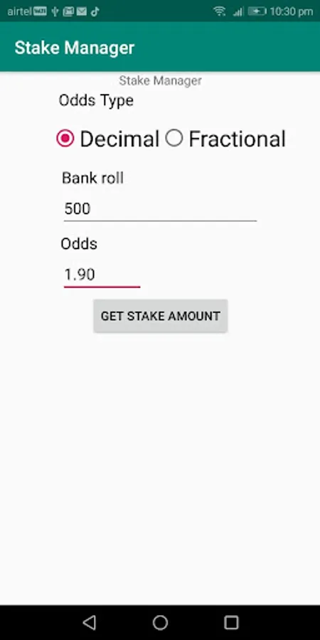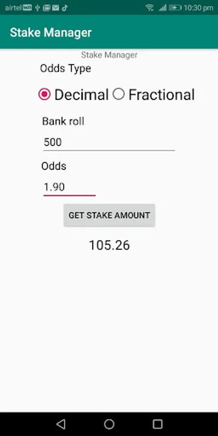 Stake Manager helps you to manage your bankroll effectively.- Due to lack of proper back roll management, many big punters got bankrupted playing emotionally with all bankroll in a single or couple of bets. Stake Manager helps you to overcome this issue.- Stake Manager will help you to sustain from a series of losses and bad betting days.- When you are in winning node Stake Manager strategically increases your stake amount based on the risk factor, which will help you to earn more money in a quick time.- While playing live betting don't bother about thinking of how much amount to stake, Just open the Stake Manager app enter bet odds which let you know the safe stake amount that you place on a bet.
